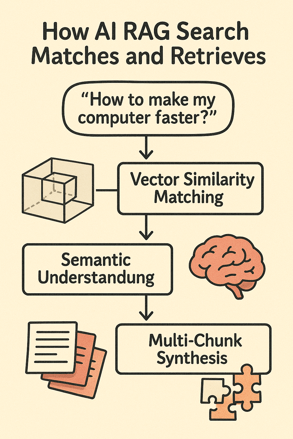 Rather than matching keywords, the system uses cosine similarity to compare the semantic meaning of the query vector against content chunk vectors. The query “How to make my computer faster?” gets converted into a mathematical representation that captures its meaning, intent, and context.