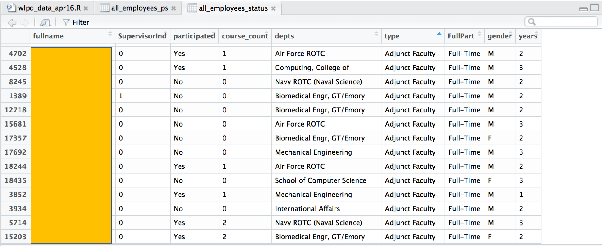 Like all tier-1 research universities, our institution has over 60 K students, 20k employees including teaching and research faculty, staff, part-time and temp. Over the years, multiple platforms have been adopted by various campus units to keep track on different sorts of employees’ data. Therefore it can be a little challenge when it comes to integrate data from different platforms about employees’ background info, like gender, years of service, position type, with data about their participation of professional development courses on campus.