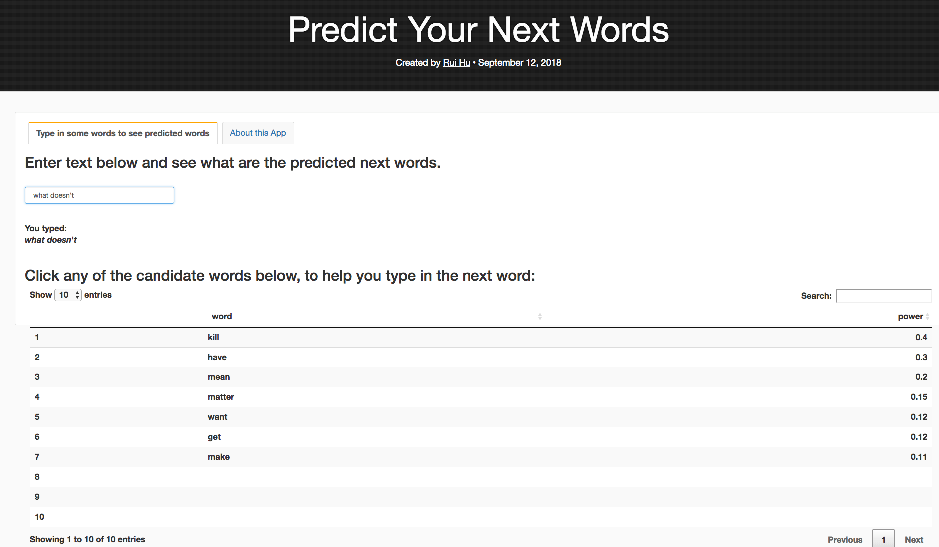 My app provides not only the top candidates for next word prediction, but also provides the weight of each candidate, using the Stupid Backoff method. I also tried to model after the cellphone text type prediction function, which allows the user to click on the preferred candidate to auto-fill the text box. Below is a screenshot of the predicted top candidate words, when you type in “what doesn’t” in the text box.